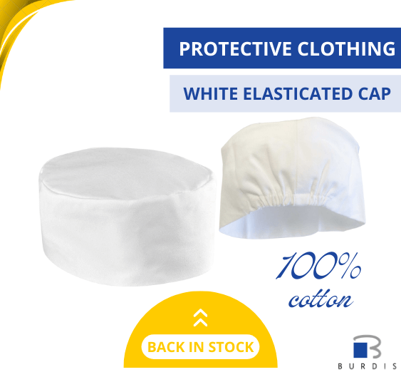 Chef skull cap made of white cotton designed to protect the operator’s head...