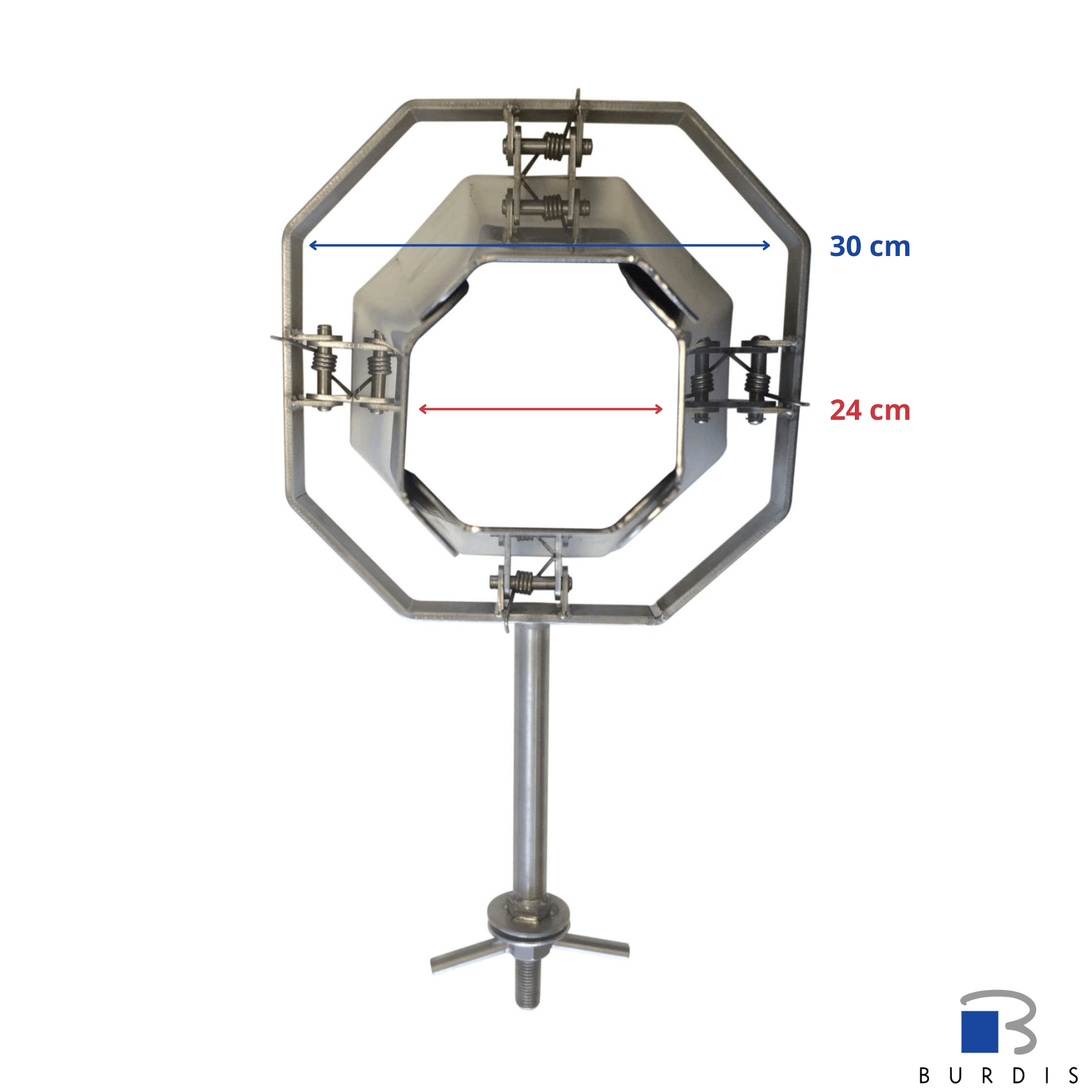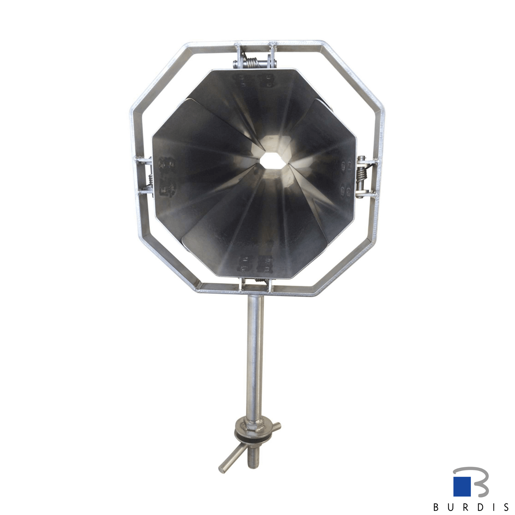 Poultry packaging funnel made of stainless steel, fitted with four spring-mounted parts expanding to let the poultry through.